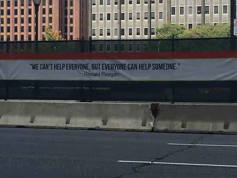 Because of the construction at Love Park we had to relocate across the street. As I waited for the rest of the team of volunteers to arrive I noticed a Ronald Reagan quote on the scaffolding around the park. “We can’t help everyone, but everyone can help someone”. I took hundreds of pictures over the year and a half travelling to Philly but none more prolific than this one. Minutes later, Margaux pulled her car up to the curb to unload the large bags full with dinners she had painstakingly prepared. No Mel today. Another long term volunteer Virginia helped as the line started to build. It was a slow week for some reason with not that many hungry people around. After we were done, we mugged for a selfie in front of an ATM, 2:44 pm to be exact. They asked if I was still going to look for Jake without Mel. I told them I was going to walk down to where we first met next to the Liberty Bell.